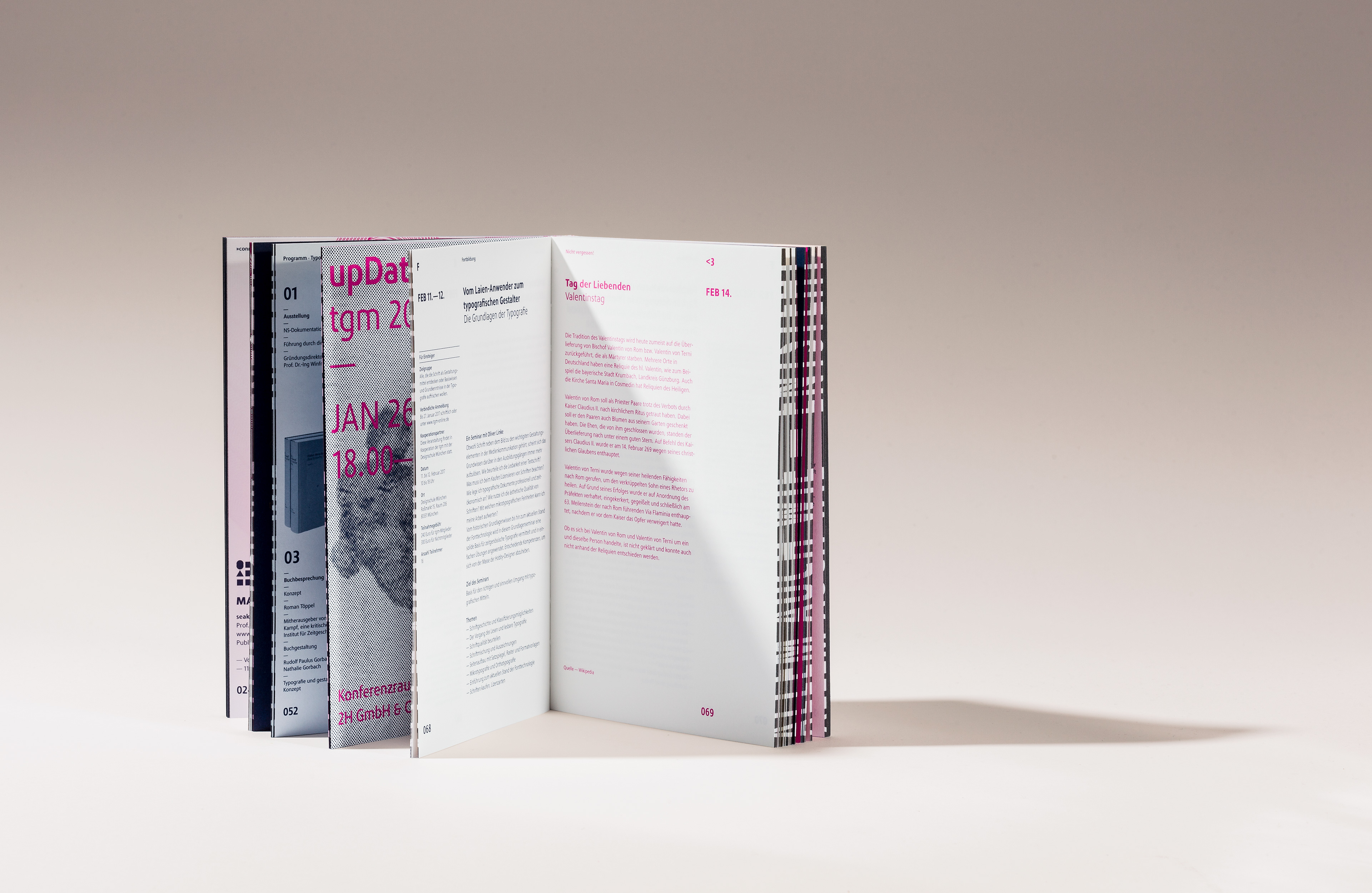 Ich entwarf die Schriftart »Crypto« aus den Elementen Dreieck, Quadrat und Kreis, die ich aus dem Logo der tgm entlehnt habe und das Buch wurde ausschließlich in den Sonderfarben Gold, leuchtendes Pink und Königsblau gedruckt. Das typografische Layout wurde mit vielen funktionalen und spielerischen Details bereichert und das Jahrbuch produktionstechnisch mehrfach veredelt. Zu nennen ist der digital aufgebrachten Farbranddruck, durch den jedes Exemplar mit einer von 50 Zeilen (Text der Jahresangabe) in einer von 35 Farbvariantengedruckt werden konnte und auch das abnehmbare Magnet-Einband, der dem Leser die Möglichkeit gab zwischen zwei verschiedene Motiven zu wählen und sich der Frage zu stellen: »Bin ich gerade in einem Connect-, oder einem Disconnect-Modus?«